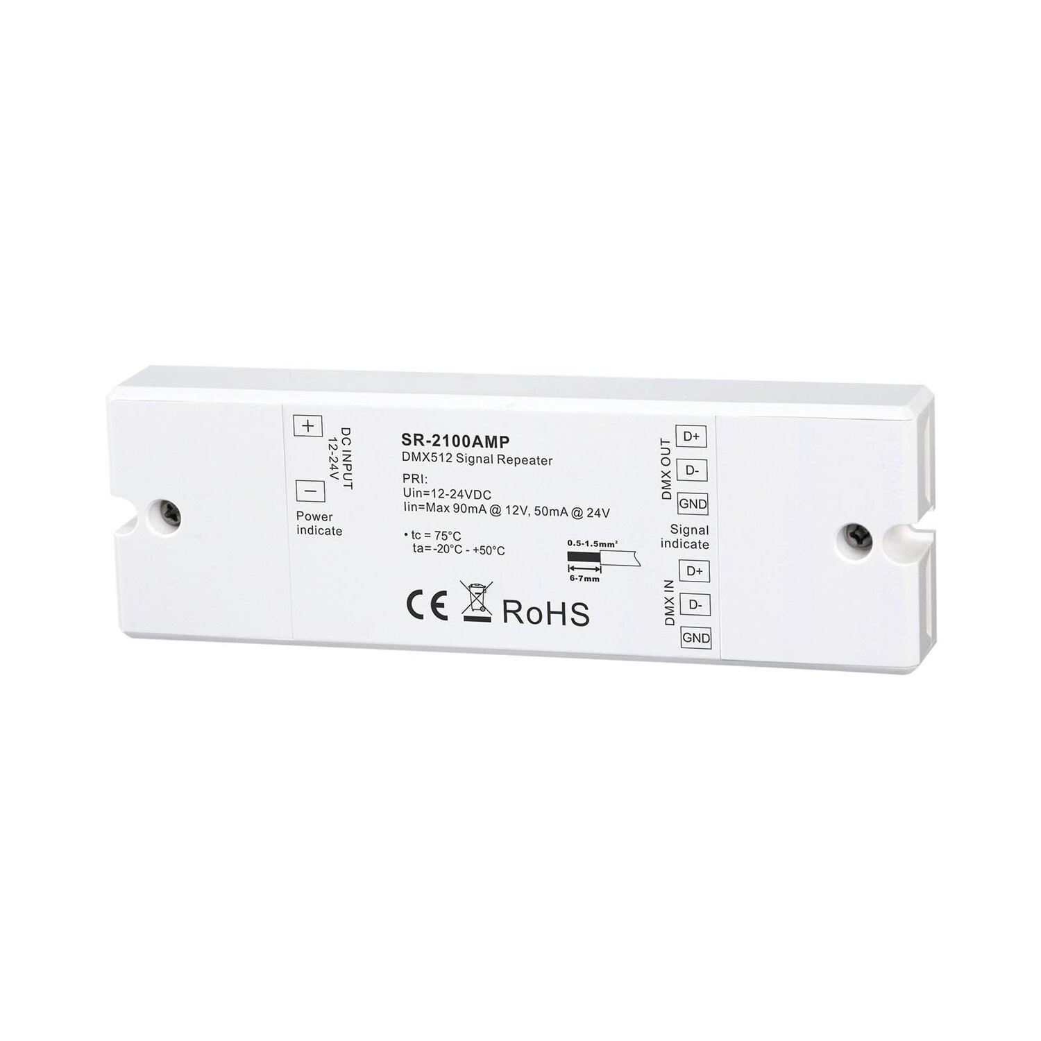 SR-2100AMP is a DMX512 signal amplifier which complies with standard protocol DMX512 (1990). With DMX signal input and DMX signal output, the signal amplifier works with DMX decoder series to expand DMX signal based on the actual lighting projects.