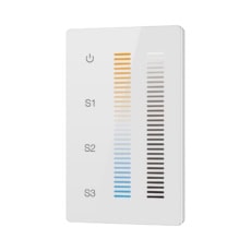The Dual Color DMX512 Controller features a touch-sensitive glass interface available in white and black, supports standard DMX512 signal output, controls CCT color, and manages one zone.