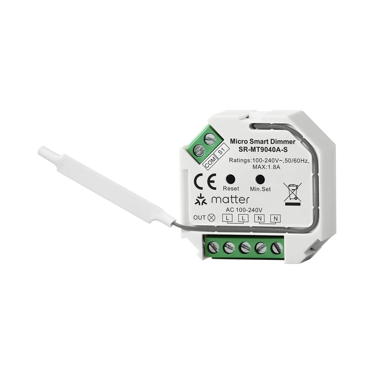 The Matter Thread Micro Smart Dimmer is a Matter thread AC phase cut dimmer with 100-240VAC wide input and output voltage, supporting resistive, capacitive, and inductive loads, featuring one channel output up to 400W with safe and reliable screw terminals for input and output, using trailing edge dimming, compatible with universal Matter gateways including Apple HomePod mini, Google Home, and Amazon Echo devices, controllable via Apple Home, Google Home, and Amazon Alexa apps, voice controllable through Apple Siri, Google Assistant, and Amazon Alexa, and designed in a mini size for easy installation into a standard wall box.