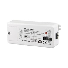 The Matter to DALI DT6 DIM+0/1-10V 2-in-1 Converter SR-2421-MT1 based on Thread provides seamless integration between Matter and DALI systems. It features a Matter signal input and outputs either DALI or 0/1-10V signals to control devices. The converter supports a wide power input range of 110-240VAC and includes a relay output, handling up to 5A for incandescent and halogen lamps, and 1.6A for LED loads. It is compatible with the universal Matter over Thread platform and offers convenient control via DIP switches for selecting DALI address or group, and choosing between DALI or 0/1-10V output. With built-in DALI bus power, it powers up to 25 DALI control gears and supports both DALI address and group control modes. The converter also allows broadcast control of all DALI devices on the line.