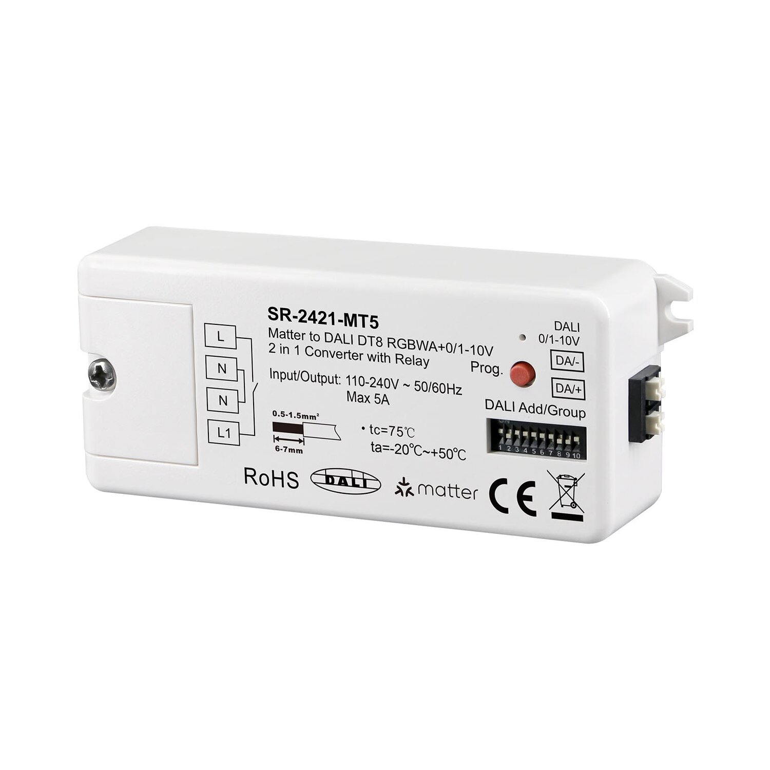 The Matter + Zigbee to DALI DT8 RGBWA+0/1-10V 2 in 1 Converter is a versatile device that bridges Matter and Zigbee signals to DALI DT8 RGBWA and 0/1-10V control, with a 110-240VAC power input. It features a relay output with a maximum of 5A for incandescent and HV halogen lamps and 1.6A for LED loads. Compatible with universal Matter over Thread platforms, this converter allows selection between DALI signal or 1-10V output via a DIP switch. It includes a built-in DALI bus power supply, eliminating the need for an external DALI bus PS, and offers up to 50mA of DALI bus power to control up to 25 DALI control gears. Color control follows DALI Device Type 8 specifications, and it supports DALI address or group control modes, allowing for selection of specific DALI addresses (00-63) or groups (0-15) via DIP switches. This device enables control of individual DALI devices, groups, or all devices on the DALI line via broadcast. It is app-controlled, touchlink remote-controlled, and supports green power kinetic switch control, with app integration through Matter, including platforms like Apple Home, Amazon Alexa, and Google Home.