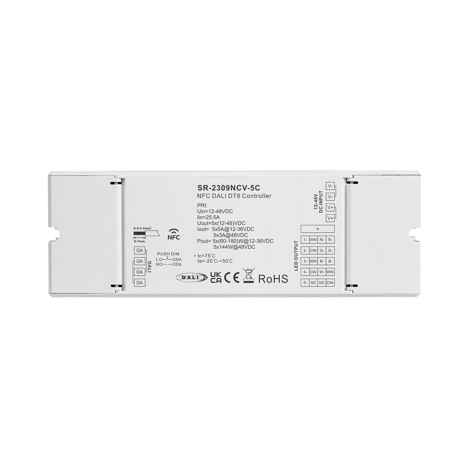 This device is a DALI-2 constant voltage control gear compliant with IEC 62386-101:2014, IEC 62386-102:2014, IEC 62386-207 Ed2, and IEC 62386-209:2011 standards. It integrates multiple device types, supporting both DALI DT6 and DT8 commands for control of five PWM output channels. The unit enables configuration via an NFC tool and app, allowing parameter setting for DT6, XY, CCT, and RGBWAF modes. It also supports advanced DALI features such as device types 251, 252, 253, luminaire status, energy monitoring, and diagnostic data. Short-circuit protection is active when the dimming level exceeds 5%. In addition to DALI control, it supports push-dim mode for color temperature and RGB control, even without a DALI connection.