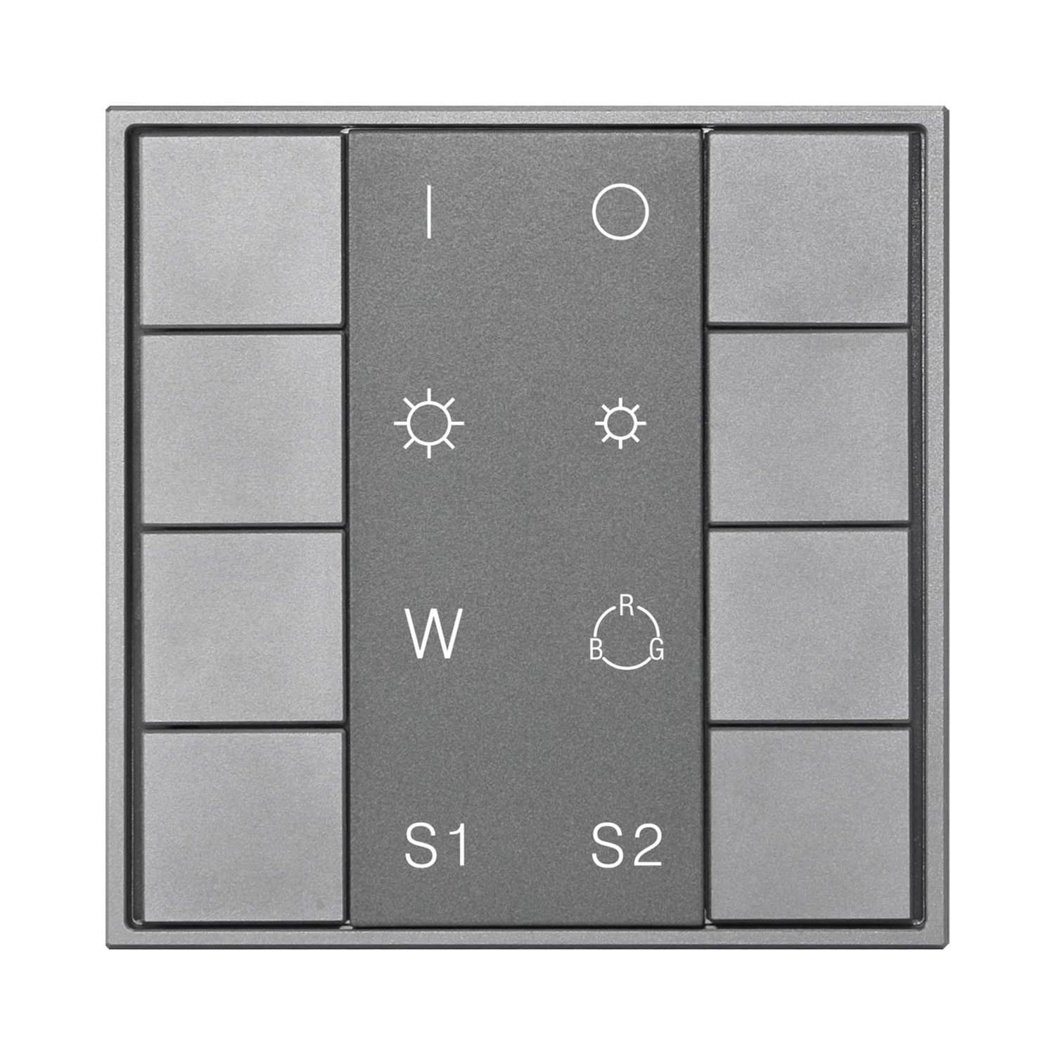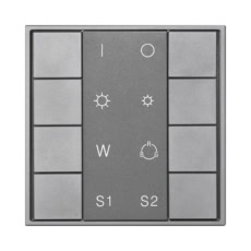 The SR-2422NK8-RGBW-G1-S2 is a DALI RGB+W DALI DT8 group&scene controller that controls 4 channels output via a single DALI address. The panel controls 1 group address and 2 scene addresses.