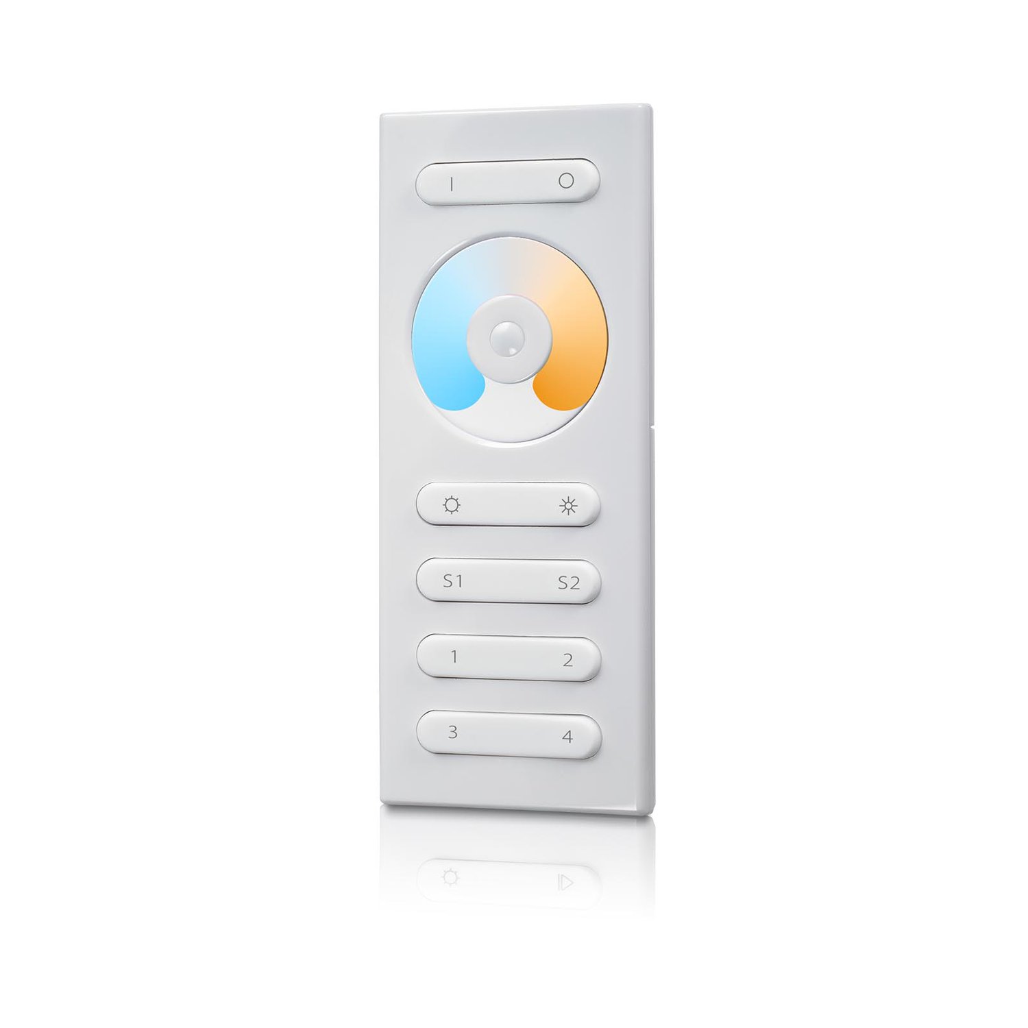 The RF Dual Color Remote Controller allows control of up to 4 zones of RF receivers for CCT lighting, is compatible with universal series RF receivers, and supports pairing with up to 8 different remote controls per receiver.