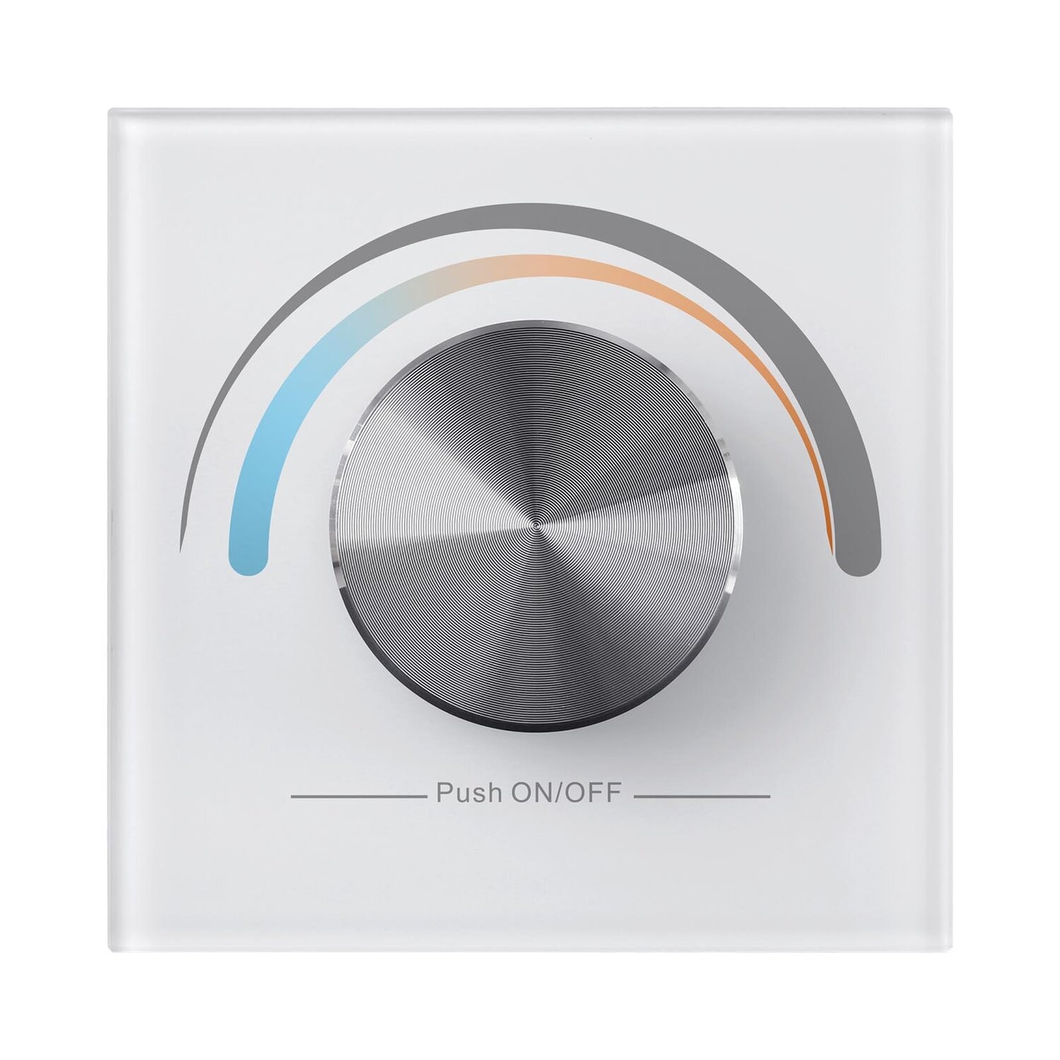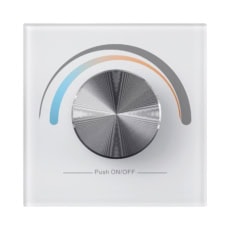 The RF Dual Color Wall Mounted Controller features a rotation-sensitive glass interface in white or black, operates at 868/869.5/434MHz radio frequency, supports CCT color control for one zone, and is compatible with all universal series RF receivers.