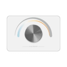 The RF Dual Color Wall Mounted Controller is a rotation-sensitive device with a glass interface available in both white and black.