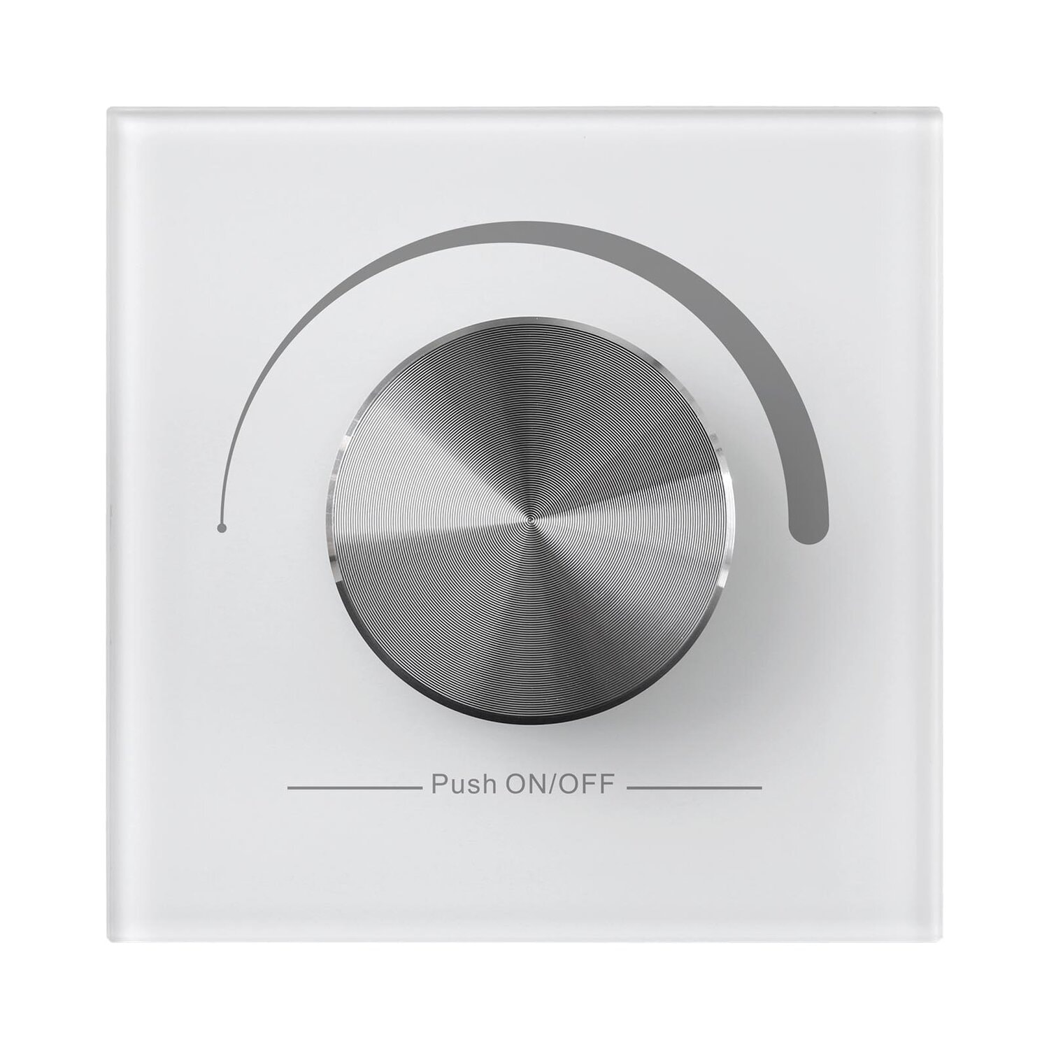 RF rotary LED dimmer SR-2836R is a rotary dimmer controller which offers both switch and smooth brightness dimming functions for single color LED lighting. Designed with sleek compact appearance, high strength tempered glass material and rotary knob, the LED dimmer switch offers accurate smooth dimming and switch functions without any flickering.