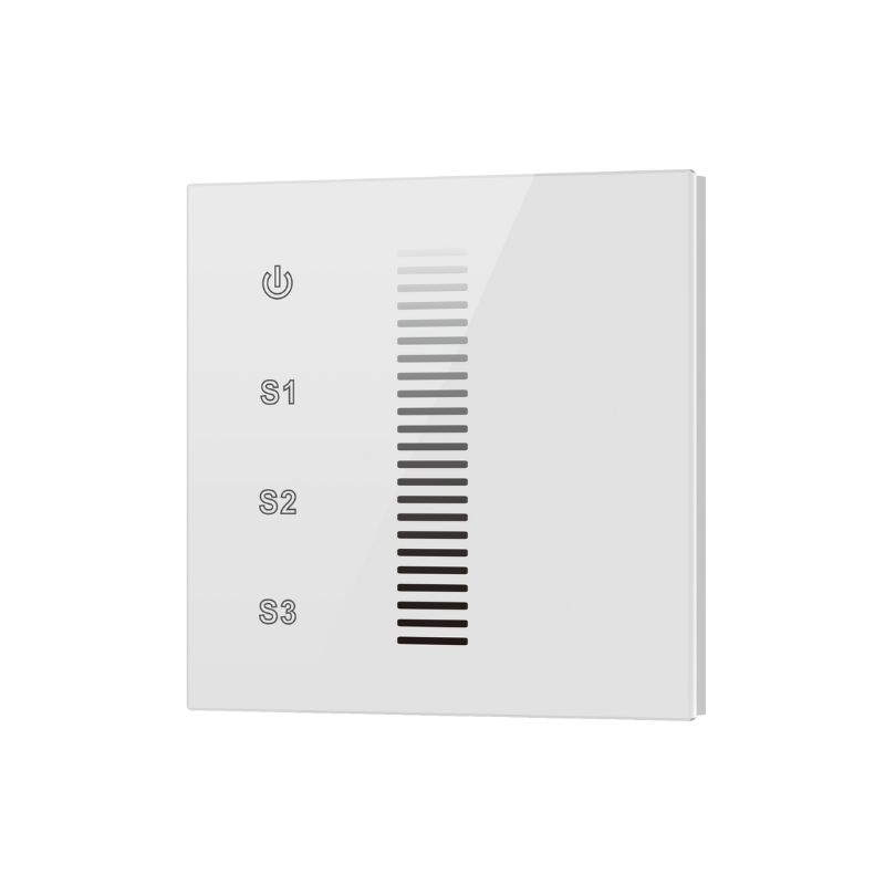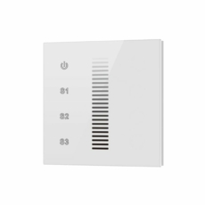 The Single Color PWM Wall Mounted Controller is touch sensitive and features a glass interface in white and black. It outputs four channels of PWM signal and is designed to control a single color.