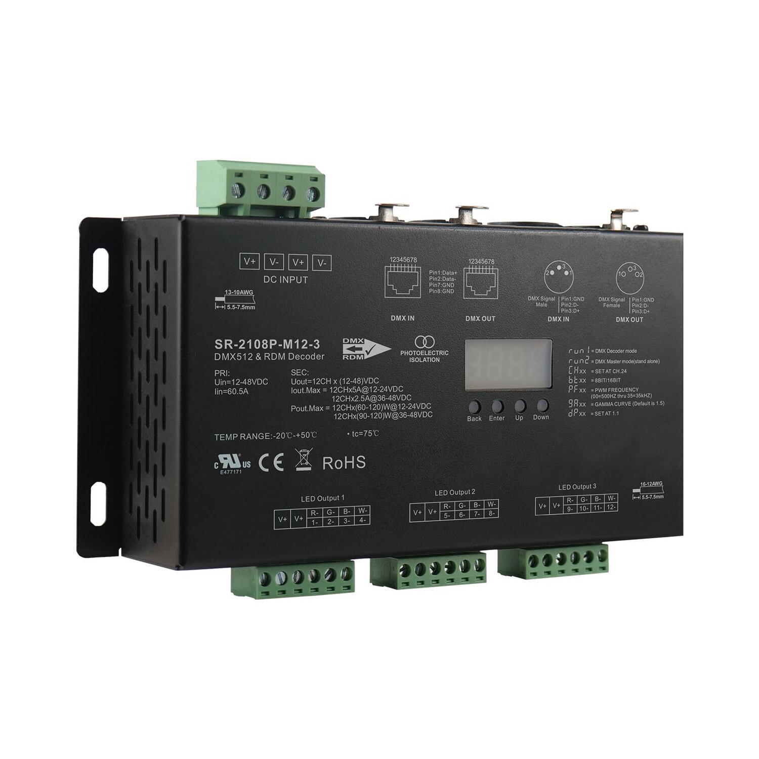 The Ultra-Pro 12CH RDM DMX512 Decoder operates in both master and decoder modes, featuring RDM functionality for enhanced control. It has a durable metal housing and a digital display that allows for easy viewing and setting of the DMX address. The device offers multiple DMX input and output ports, including RJ45 and XLR3/5 connectors. With a total of 12 PWM output channels configured in a common anode setup, users can set the DMX channel quantity to 1CH, 4CH, 6CH, or 12CH. The PWM output resolution is adjustable between 8bit and 16bit, while the output PWM frequency can be set between 500Hz and 35kHz. Additionally, the dimming curve gamma value is adjustable from 0.1 to 9.9, and the decoding mode is also settable. The unit features galvanic isolation for improved performance and safety.
