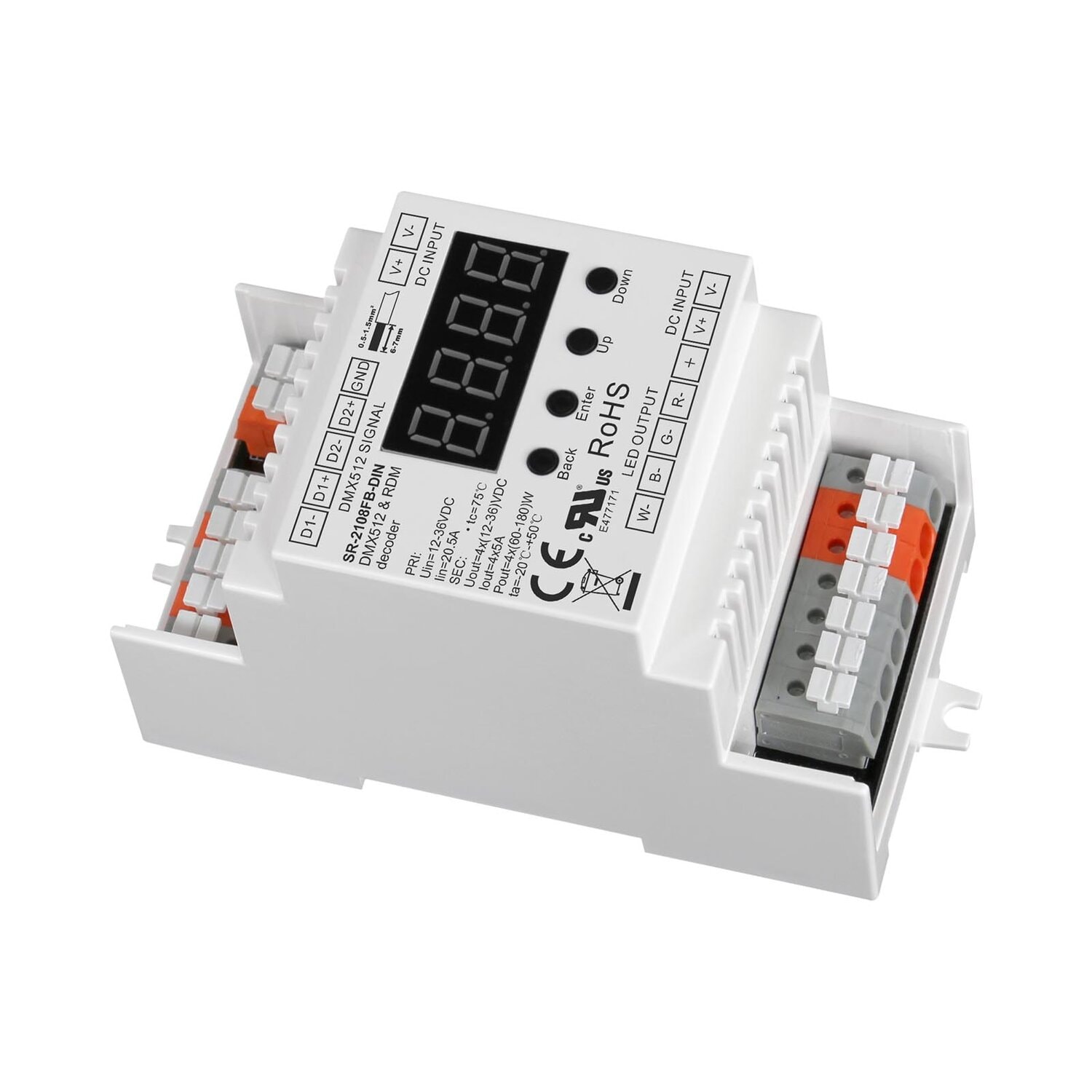 It features a digital display for direct data viewing and easy DMX address configuration, and offers four common anode PWM output channels with selectable DMX channel modes from 1CH to 4CH.