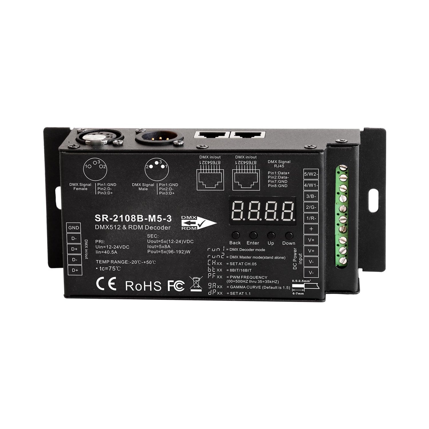 The Ultra-Pro 5CH RDM DMX512 Decoder features both master and decoder modes with RDM functionality, housed in a metal casing with a digital display for direct data viewing and DMX address configuration.