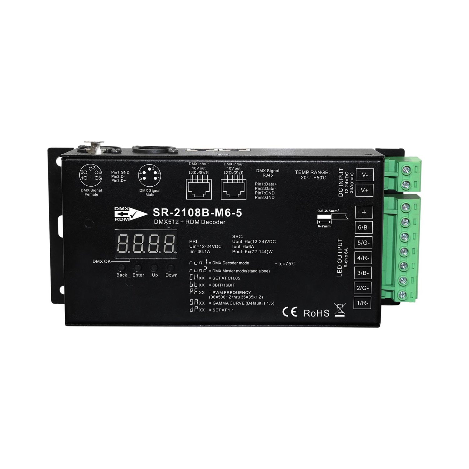 Product Description. This Ultra-Pro 6CH RDM DMX512 Decoder is with master & decoder mode and RDM function. By virtue of metal housing and digital display, it can show data directly, and set and show DMX address easily. This deice is with multiple kinds of DMX in/out ports: RJ 45, XLR , normal screws. It has a total of 6 PWM output channels, and common anode. DMX channel quantity can be set as 1CH or 6CH. PWM output resolution ratio can be set as 8bit , 16 bit. With settable decoding mode, its output PWM frequency can be set from 500Hz to 35KHz, and the output dimming curve gamma value can be set from 0.1 to 9.9.