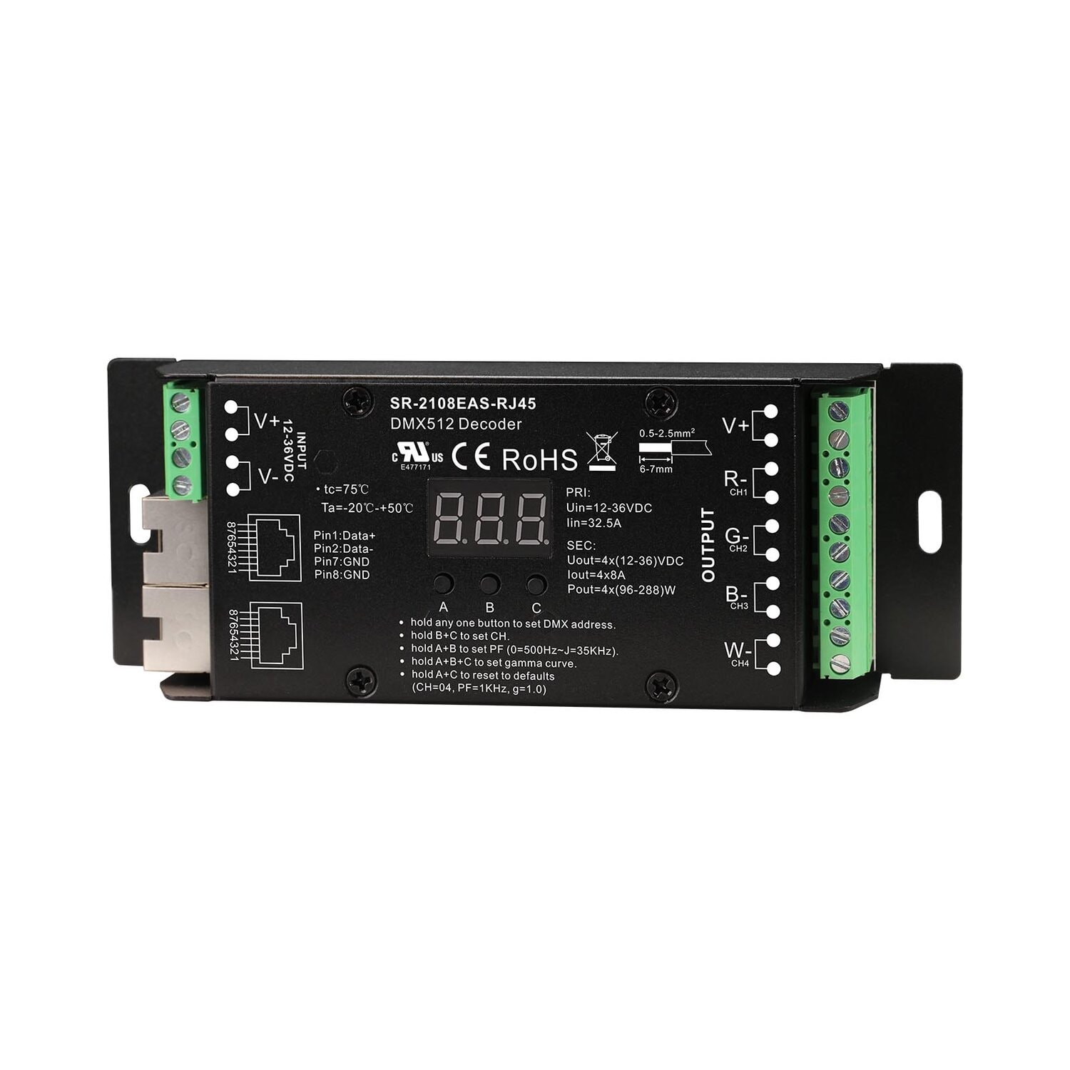 SR-2108EAS-RJ45 is a 4 channels constant voltage DMX & RDM controller that supports real 16 bit PWM resolution. The DMX controller is designed with both master mode and slave mode which are easy to switch.