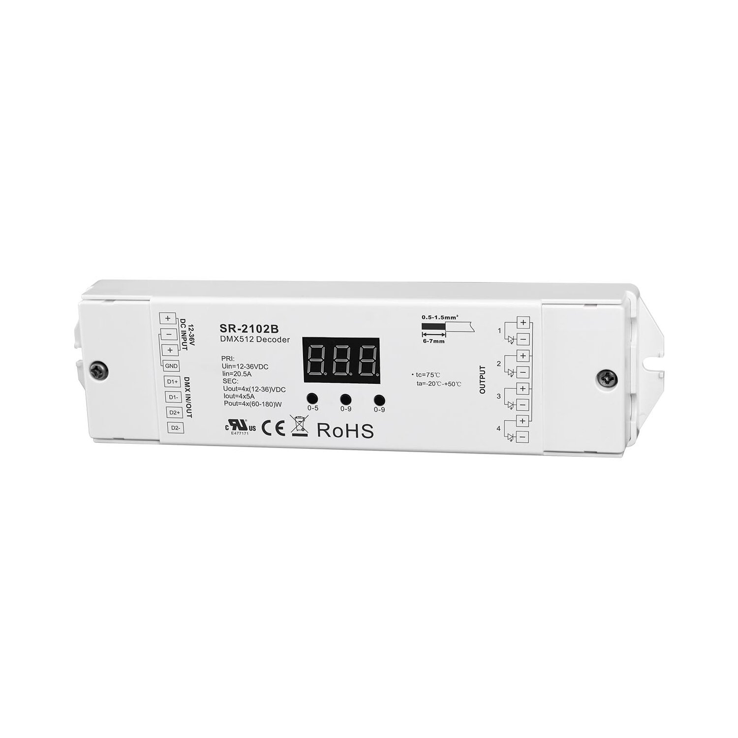 The SR-2102B is a constant voltage DMX512 decoder with 3 channel or 4 channel selectable, 5A per channel output and available in 12-48VDC output. The DMX512 decoder is designed with DMX512 compliant control interface, which enables users to set DMX address freely and shows the address on digital numeric display.