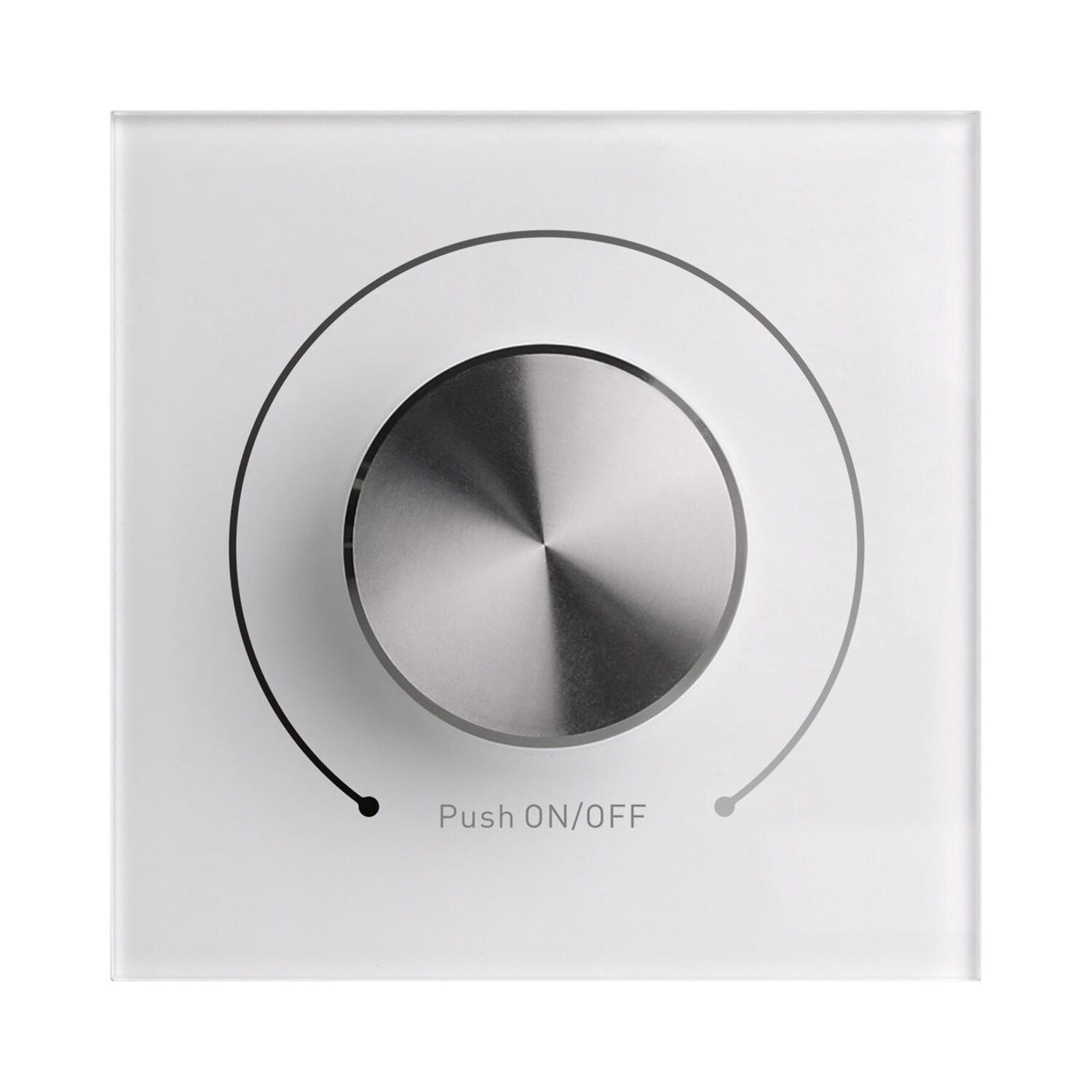 The Wall Mounted RF AC Dimmer is rotation-sensitive and operates at a 869.5/434MHz radio frequency, offering compatibility with all universal series RF receivers. It allows for control of single-color lighting across one zone of an RF receiver, featuring a safe and reliable full isolation design for enhanced functionality and durability.