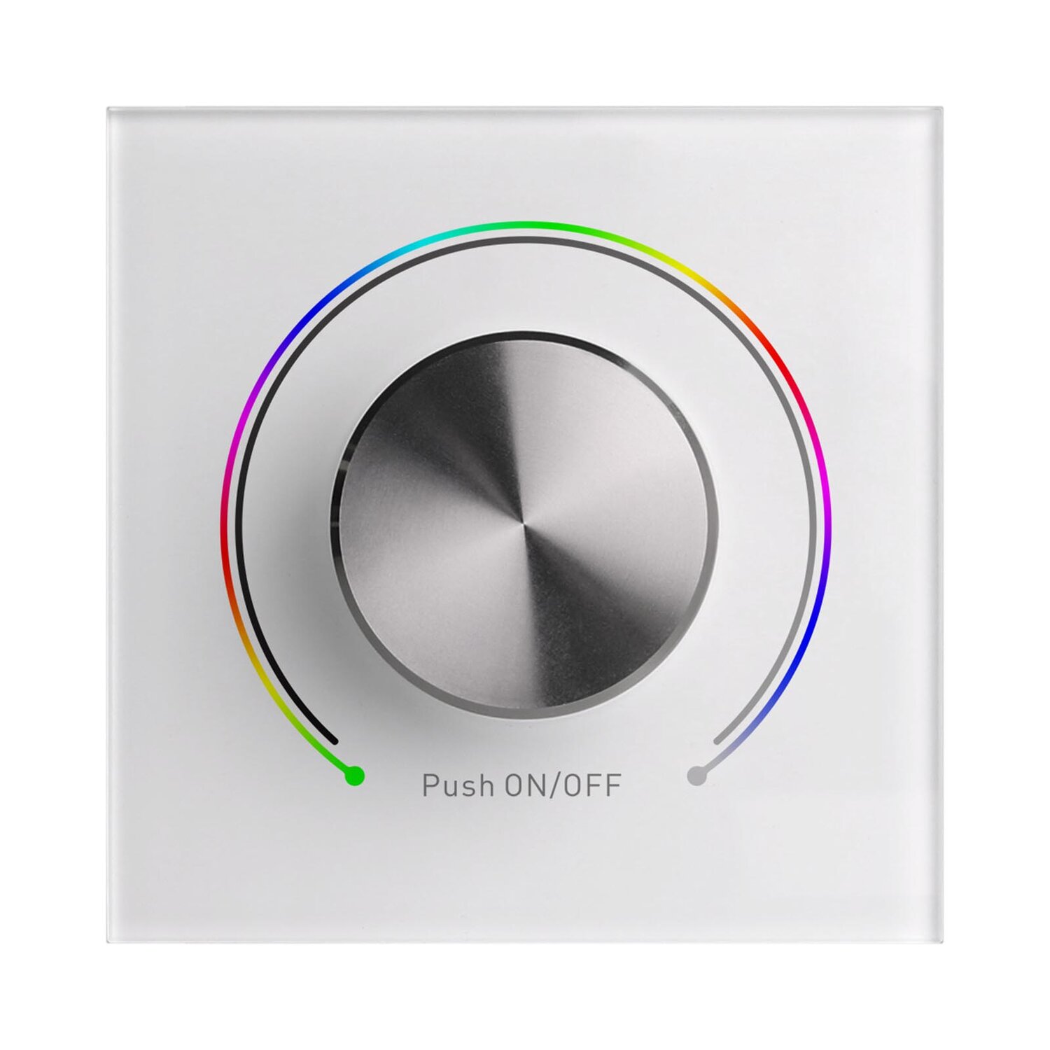 The Wall Mounted RF AC RGB Controller is rotation-sensitive and operates at 869.5/434MHz radio frequency, ensuring compatibility with all universal series RF receivers. It provides control over RGB color for one zone of an RF receiver, featuring a safe and reliable full isolation design.