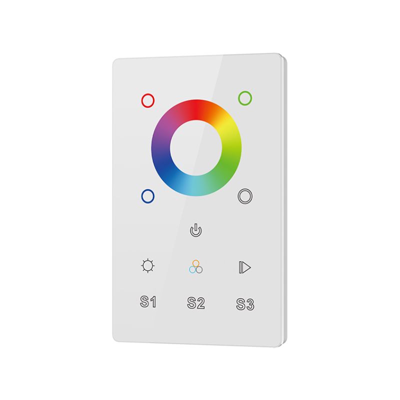 The Wall Mounted RGBW PWM Controller is touch sensitive and features a glass interface available in white and black. It provides four channels of PWM signal output and is designed to control RGBW colors.