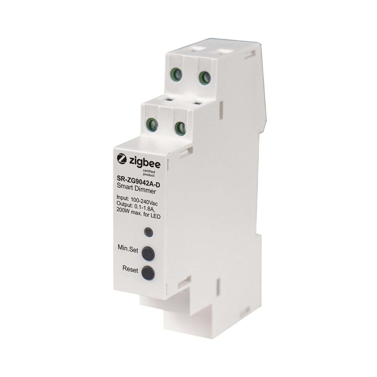 The ZigBee Din Rail Smart Dimmer supports both two-wire installations without a neutral lead and three-wire installations with a neutral lead, featuring advanced microprocessor control, smart light source detection, active power and energy metering, soft start, and adjustable minimum dimming level and startup brightness. It is compatible with various types of switches including momentary, toggle, and three-way, uses a semiconductor electronic switch as the active element, and is designed for installation in wall switch boxes that meet applicable regulations; a Bypass unit is available as an extension.